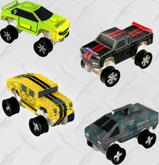 All vehicle bodies are constructed of precut paper & glue, the plastic chassis and wheels,